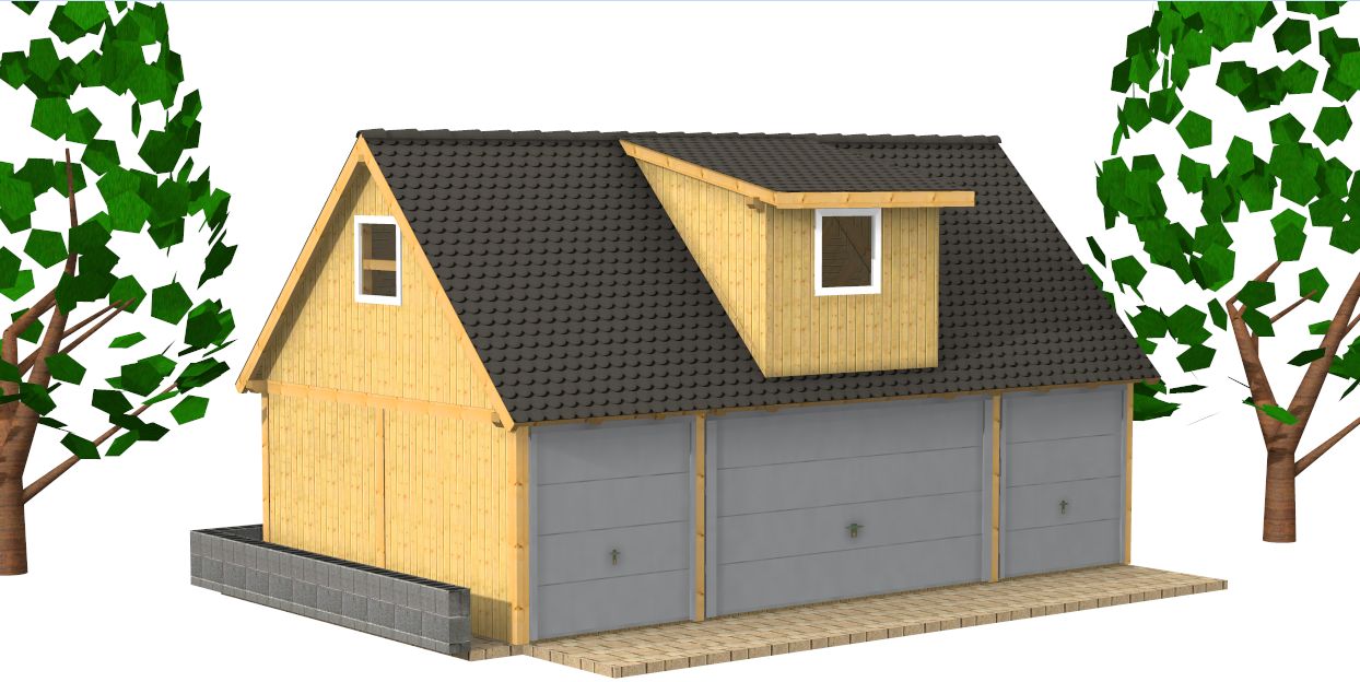 There is a three bay garage made of solid structural timber KVH (spruce) kilin-dried to a